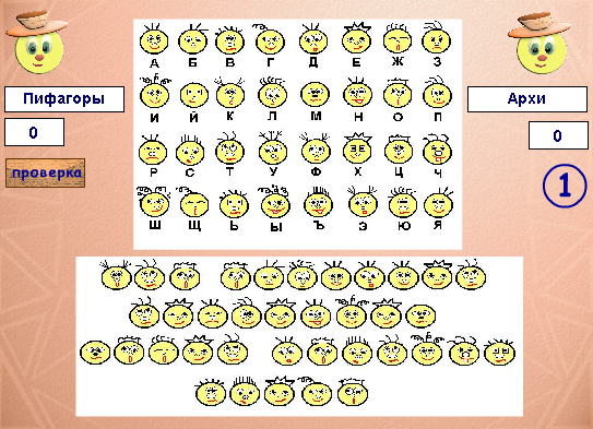 Далее – первый тур (разминочный). Описание: на экране расположены один над другим два рисунка. Верхний содержит набор из 32 элементов (смайликов), каждому из которых соответствует единственная буква из русского алфавита (каждый элемент находится над соответствующей ему буквой). Буквы не повторяются. Второй рисунок содержит набор 37 элементов из верхнего рисунка. Элементы могут повторяться, буквы под элементами отсутствуют. Так же на экране расположена кнопка (проверка), при нажатии на которую на экране вместо второго рисунка появляется зашифрованный текст. Задание: расшифровать текст, записанный с помощью элементов. Содержание: зашифрованный текст – «Кто обладает терпением, может достичь всего!»