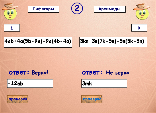 Второй тур (тематический). Описание: на экране расположены два окна, содержащих буквенные выражения (каждой команде по выражению), два окна для ввода ответа и две кнопки (проверки). Ответ вводится без пробелов. Нажатие одной из кнопок проверки выводит результат ответа соответствующего выражению («верно» или «неверно»). Задание: упростить выражение, найти самый короткий ответ. Содержание: задание для первой команды: 4ab+4a(5b-9a)-9a(4b-4a), ответ:-12ab; задание для второй команды: 3kn+3n(7k-5n)-5n(5k-3n), ответ: -nk.