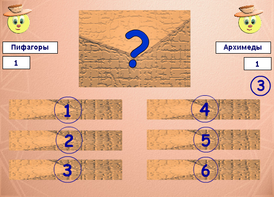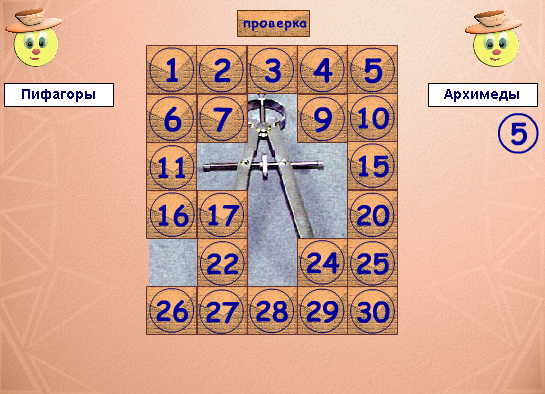 Пятый тур. Описание: на экране расположены тридцать квадратных пронумерованных карточек. Они расположены в шесть рядов по пять. Под ними скрыто изображение школьных предметов. Таких слайдов в туре четыре. Задание: команды по очереди называют номер карточки, которую учитель «убирает» с экрана. Если команда «убирающая» карточку отгадала, какой объект скрыт, то учитель переходит к следующему слайду. Иначе, право «убрать» следующую карточку предоставляется другой команде. Содержание: на слайдах последовательно размещены циркуль, учебник алгебры, парта, доска.