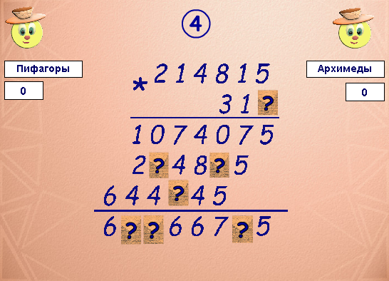 Четвертый тур (арифметический). Описание: на экране выполнено сложение двух чисел (шестизначного и пятизначного) – на первом слайде и умножение (шестизначного и трехзначного) – на втором. Действия выполнены верно, но некоторые цифры первого, второго числа, решения и ответа скрыты карточками. Задание: догадаться, какие цифры скрыты.
