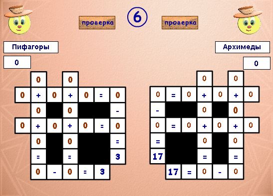 Шестой тур (головоломки). Описание: на экране – два математических кроссворда (для каждой команды по одному). Кроссворды представляют собой расположенные симметрично примеры на сложение и разность, ответы которых строго установлены . Вместо слагаемых, вычитаемых и уменьшаемых в ячейках размещены нули. Так же на экране расположены две кнопки (проверки), каждая из которых соответствует одному кроссворду и расположена над ним. При нажатии на кнопку «проверка», под кнопкой появляется результат («верно» или «неверно»). Таких слайдов в туре два. Второй слайд дополнительный (для случая оставшегося времени). Задание: заполнить все нули в кроссвордах числами (от 1 до 12) таким образом, чтобы равенства получились верными. Числа не должны повторяться. Содержание: возможный вариант правильных ответов для двух команд .