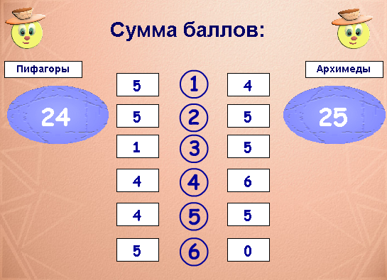 экране появляется последний слайд, где автоматически подсчитывается сумма баллов команд за все шесть туров, там же можно посмотреть выставленные баллы за каждый тур и вернуться к любому из туров. Учитель вручает капитанам команд грамоты, отмечает самых активных учеников, благодарит всех за участие в игре.